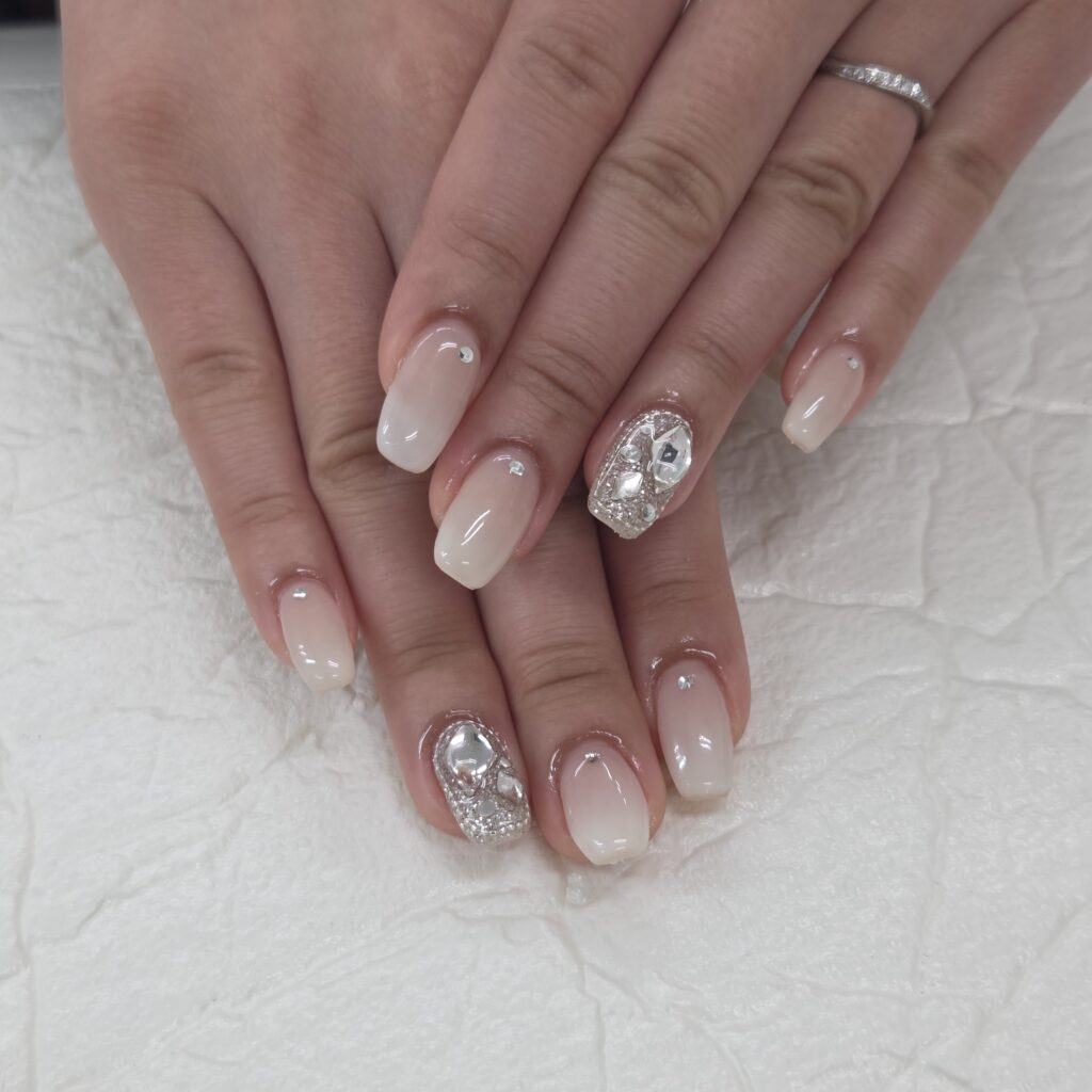 シンプルな白のグラデーションに大きめストーンの埋め尽くしがキラキラと輝いて新年のお祝いにもぴったりなネイルです♪