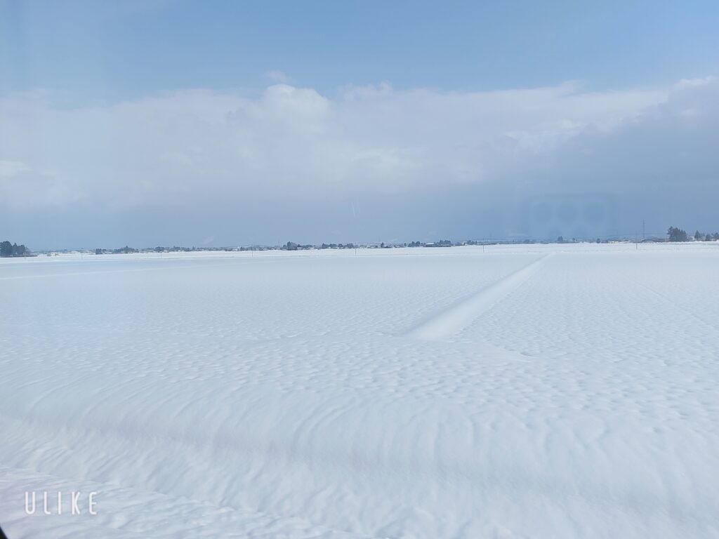 稲刈り後の田んぼに雪が積もり、足跡もない雪原のようになっていて感動しました(*’▽’)