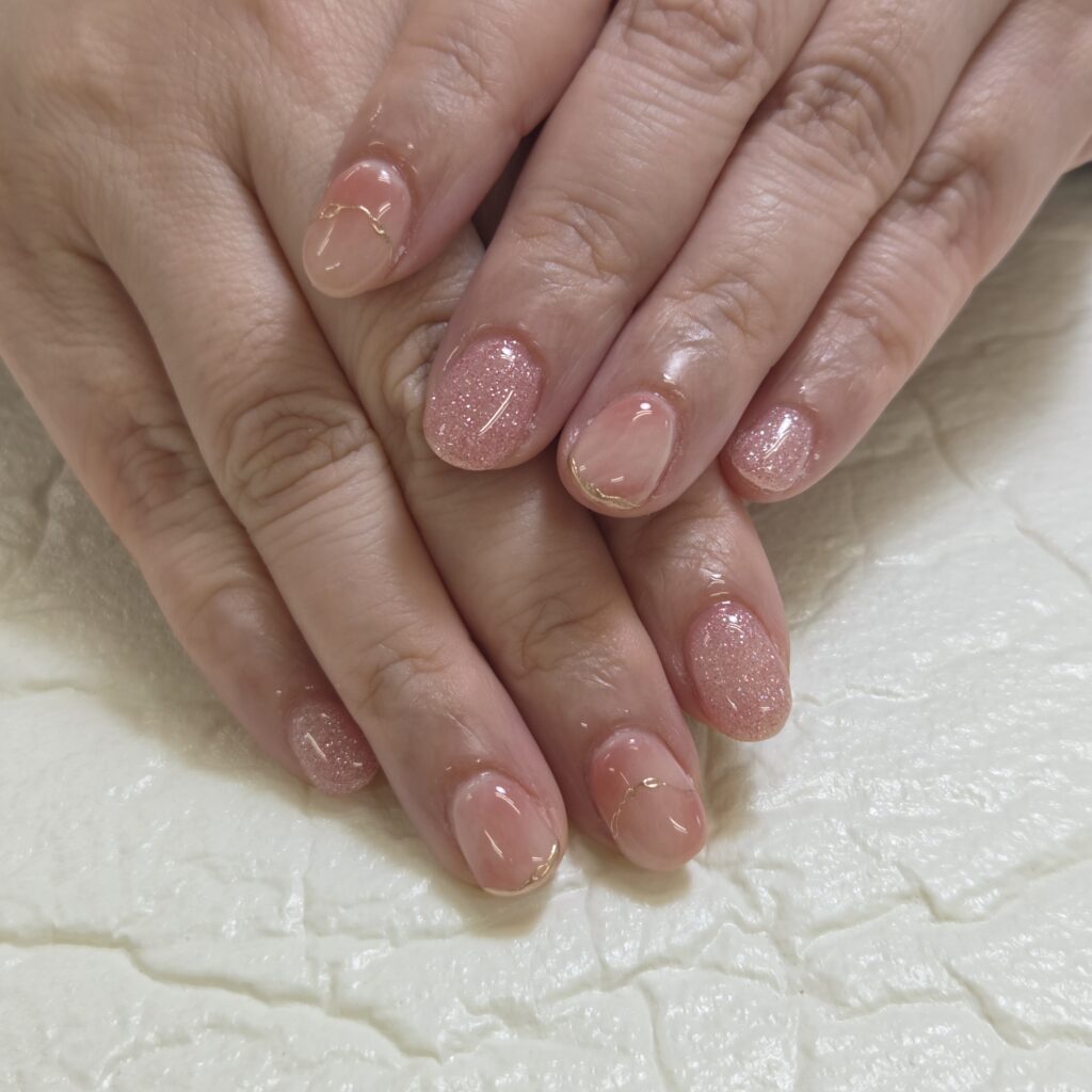 ピンクとベージュのマーブルにピンクのラメが春らしいネイルです🌸